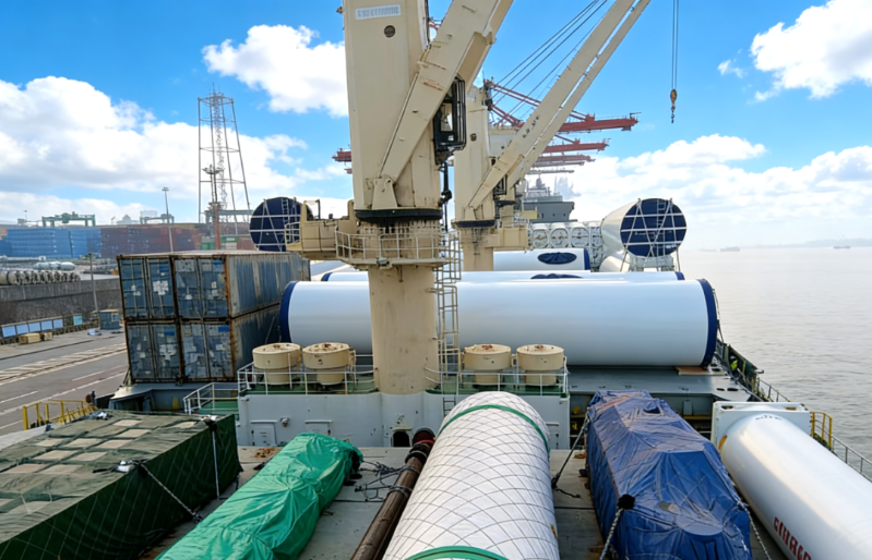 本航次货物将分卸3个目的港,品类复杂、流向分散,对积载与运输组织提出了较高要求。张家港外代提供船货代一体化服务,团队积极协调各方资源提前与码头、货主及海事部门沟通,精准对接货物配舱与通关流程,全力保障货物顺利集港、按时装船。 特别是在货物种类繁杂、出口要求高的情况下,张家港外代与船方密切协作,落实相关单证与操作安排确保航次任务有序推进。在设备集港期间,团队以集港现场需要为最高标准,克服恶劣天气的影响,组织外租机械在塔筒进港当天完成卸车和海运工装的安装,助力车队返程二次运输设备集港,保障了风电塔筒的顺利装船及出运。