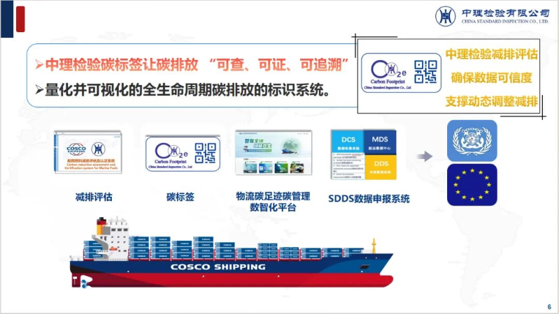 依托中理检验的第三方评估,可为企业出具物流供应链绿色认证证书,并授予运输服务碳标签,助力中国企业跨越国际绿色贸易壁垒,满足全球市场日趋严格的减碳合规要求,有效助力运输服务企业降低国际碳合规成本,为出口企业降本增效、绿色出海提供坚实支撑。